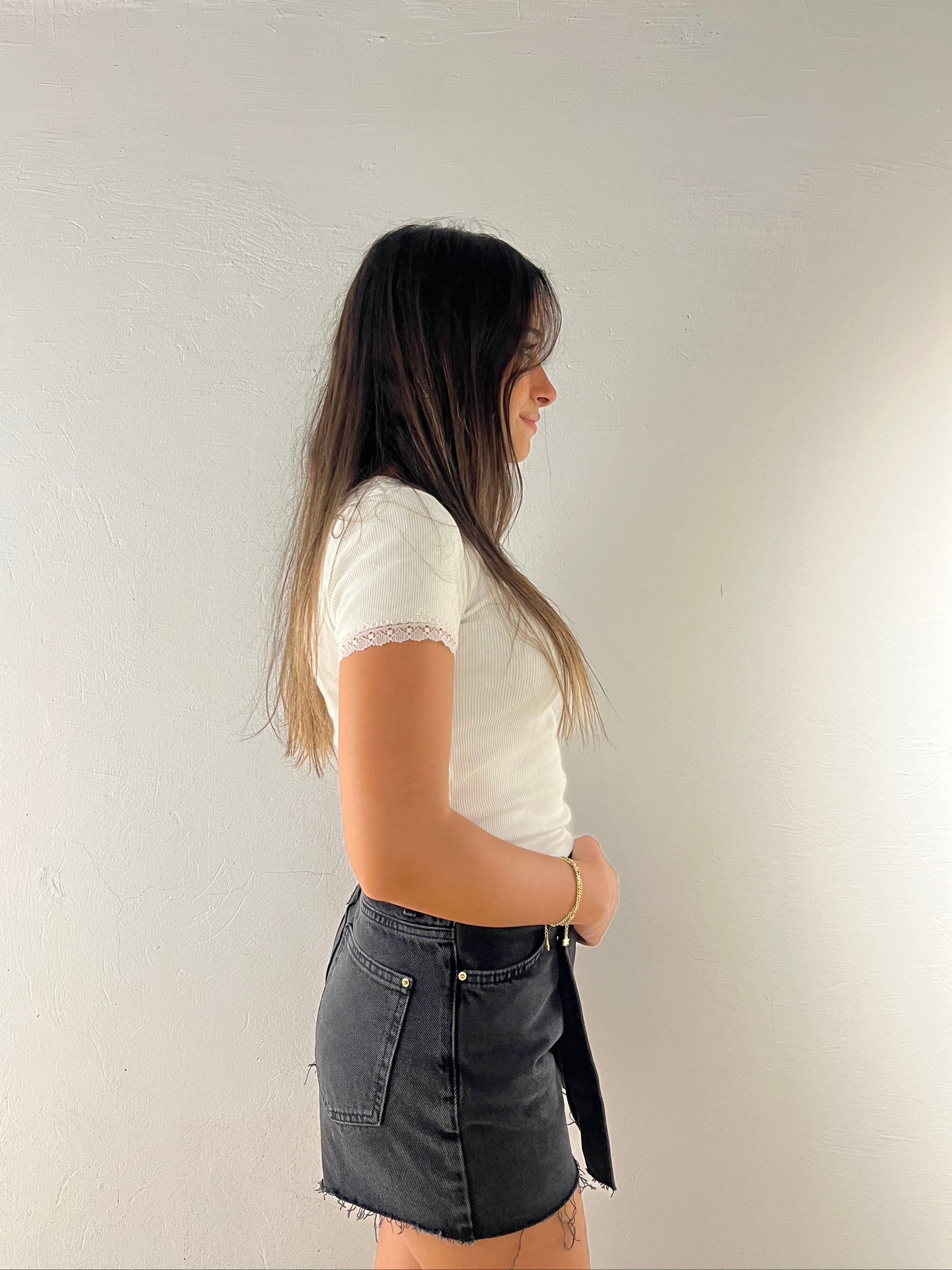 A trendy black denim skort that combines the chic look of a skirt with the comfort of shorts. Featuring a stylish front overlap design with gold button details and a raw hem finish, this piece is perfect for casual outings and everyday wear. Easy to style with tops or crop tees for an effortlessly cool look.